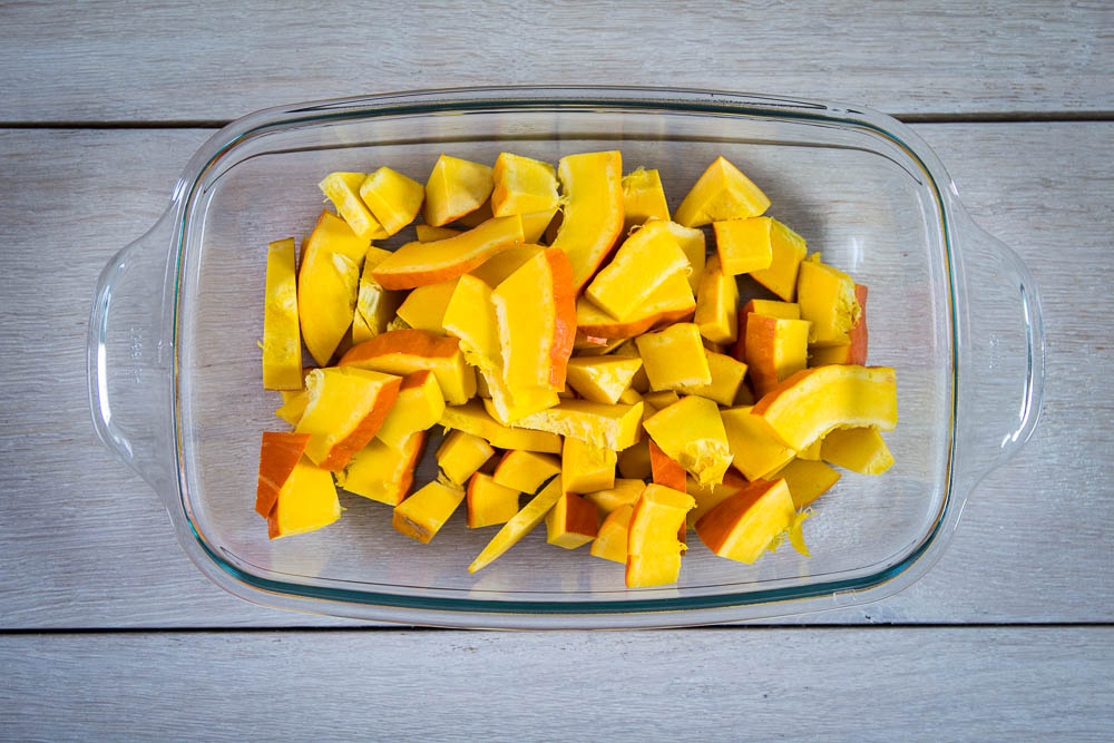 Den Kürbis waschen, aushöhlen, in kleine Stücke schneiden.