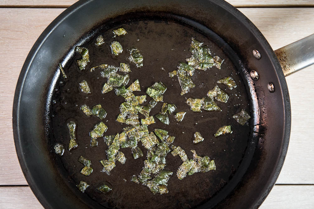 Die Butter in einer Pfanne schmelzen lassen. Die Salbei-Blätter hinzufügen.